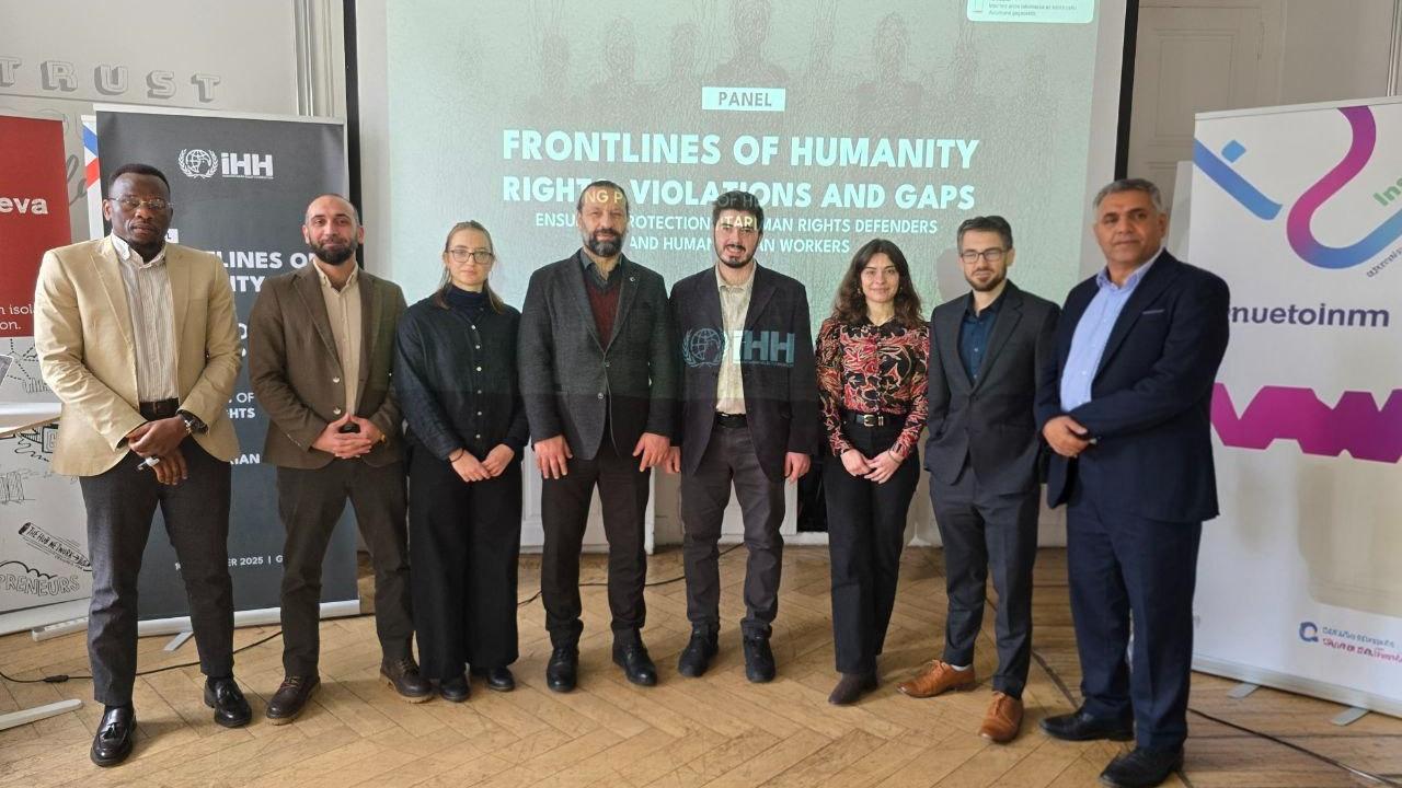 İHH, Cenevre’de Birleşmiş Milletler Genel Merkezi Binası’nın önünde düzenlediği basın açıklaması öncesinde Impact Hub Grand Salon’da düzenlediği panelde, çatışma bölgelerinde görev yapan insani yardım çalışanları ve insan hakları savunucularının karşı karşıya kaldığı artan riskler, uluslararası hukuk çerçevesinde mevcut koruma mekanizmaları ve sahadaki uygulamalarda görülen yapısal boşluklar kapsamlı biçimde ele alındı. Panel; İrfan Tatlı’nın moderatörlüğünde yapılırken, uluslararası yardım kuruluşu Oxfam’ın Cenevre Direktörü Mathew Truscott, İngiltere’deki Kent Üniversitesinden akademisyen Shahd Hammouri, Filistin için Adalet Kuruluşunda araştırma direktörü ve Avukat Henriette Willberg ile Yeryüzü Avukatları Derneğinden avukat Hüseyin Dişli konuşmacı olarak katıldı. Panelin ardından, çatışma bölgelerinde görev yapan insani yardım çalışanları ve insan hakları savunucularına yönelik ağırlaşan hak ihlallerine ilişkin uluslararası topluma çağrıda bulunmak amacıyla Birleşmiş Milletler Cenevre Ofisi (UNOG) Palais des Nations önü – Broken Chair yanındaki alanda basın açıklaması yapıldı. Açıklamayı İHH Mütevelli Heyeti Üyesi Uğur Yıldırım yaptı.