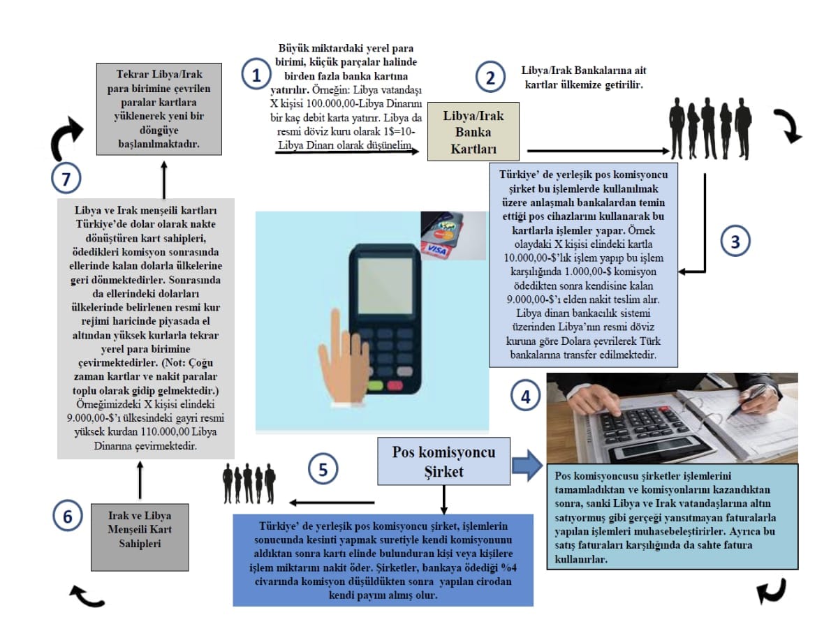 Normalde buraya gelip mal ve hizmet almaları gerekiyordu. Ancak şemada görüldüğü üzere olay bir ‘varlık kaçırma’ ve aklama işine dönüştü. Kağıt üzerinde altın başta olmak üzere mal ve hizmet almış gibi gösterilerek milyonlarca dolar POS cihazları üzerinden bankacılık sistemine sokuldu.