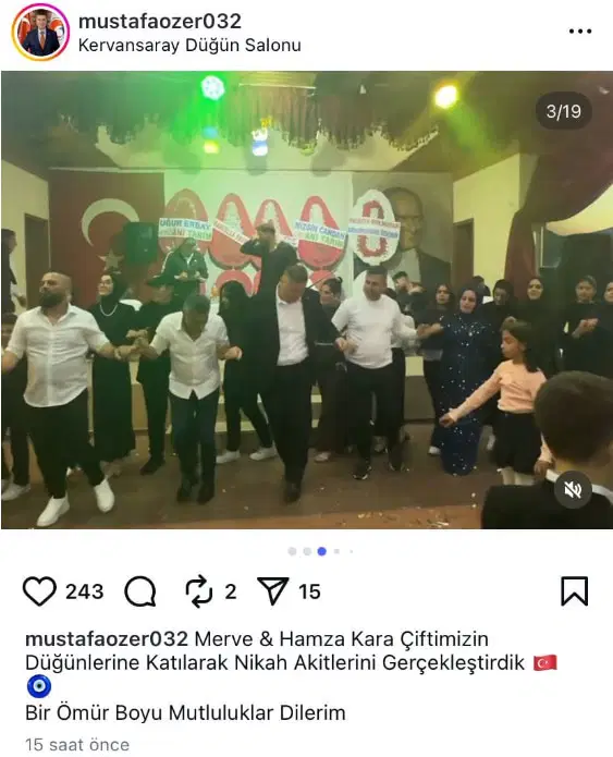 Özer kişisel sosyal medya hesabından paylaştığı Isparta’da katıldığı düğündeki halay görüntülerini “Merve & Hamza Kara Çiftimizin Düğünlerine Katılarak Nikah Akitlerini Gerçekleştirdik, Bir Ömür Boyu Mutluluklar Dilerim” notuyla yayınladı.